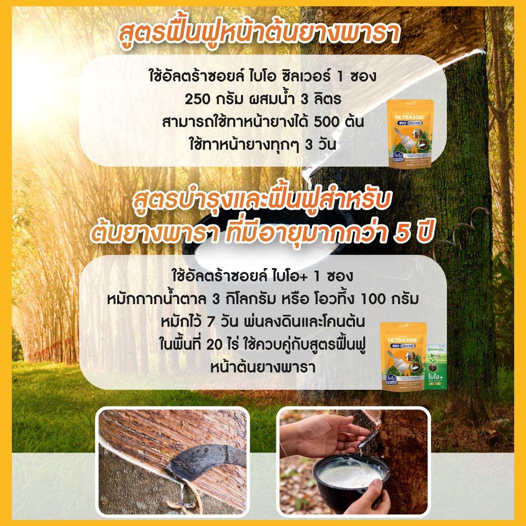 - สูตรฟื้นฟูหน้าต้นยางพารา ใช้อัลตร้าซอยล์ ไบโอ ซิลเวอร์ 1 ซอง 250 กรัม ผสมน้ำ 3 ลิตร สามารถใช้ทาหน้ายางได้ 500 ต้น ใช้ทาหน้ายางทุกๆ 3 วัน